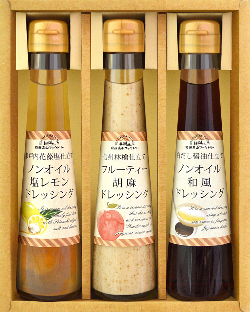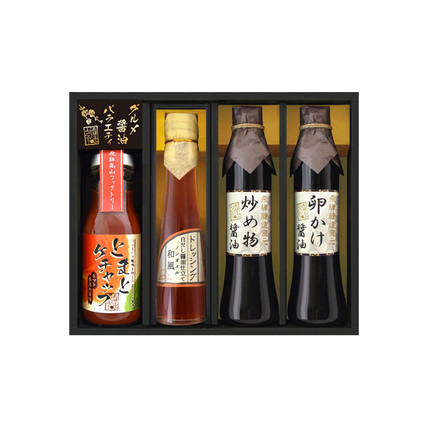 飛騨高山老舗醤油蔵で造られたこだわり醤油、サラダ以外にもさまざまな料理で活躍するオリジナルドレッシングに、ひとつひとつ丁寧に手作りされたオリジナルのとまとケチャップが入ったバラエティ豊かな調味料ギフトです。