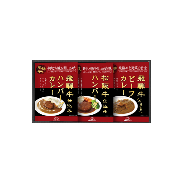 誰もが大好きなハンバーグとカレーのセット。ハンバーグに使用した牛肉は松阪牛・近江牛のブランド牛にこだわり、上質な脂と旨みを楽しめます。また、カレーには飛騨牛を使用し、コクと旨みを閉じ込めてじっくり煮込んだ飛騨牛入りカレーと、飛騨牛入りハンバーグカレーのボリューム感たっぷりのギフトです。