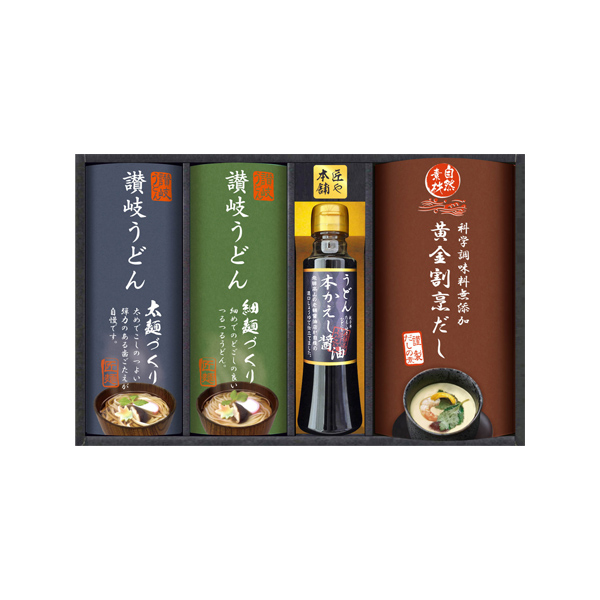 折り重ね製法により造られたコシのある讃岐うどんと、化学調味料・保存料無添加、国産原料だけで造った和風黄金だし、飛騨高山の老舗醤油蔵で造られた醤油、うどん用のカレーを詰め合わせた、うどんを存分に楽しめるセットです。