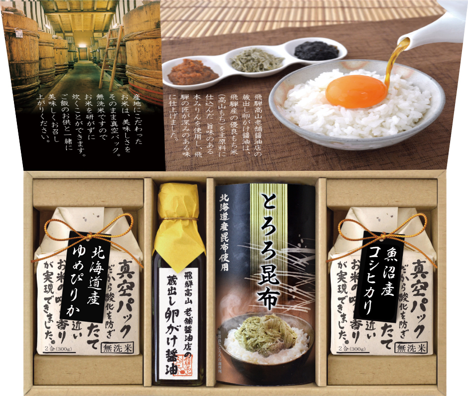 真空パックだから酸化を防ぎ、新鮮つきたてそのままに近いお米のギフトです。魚沼産のコシヒカリと、卵がけご飯にぴったりの北海道産のゆめぴりかをセット。また、飛騨高山のお醤油に、飛騨産の優良もち米(高山もち)を主原料に、伝統の技で仕込んだ旨みのある本みりんと合わせた、美味しい卵がけ醤油も入っています。