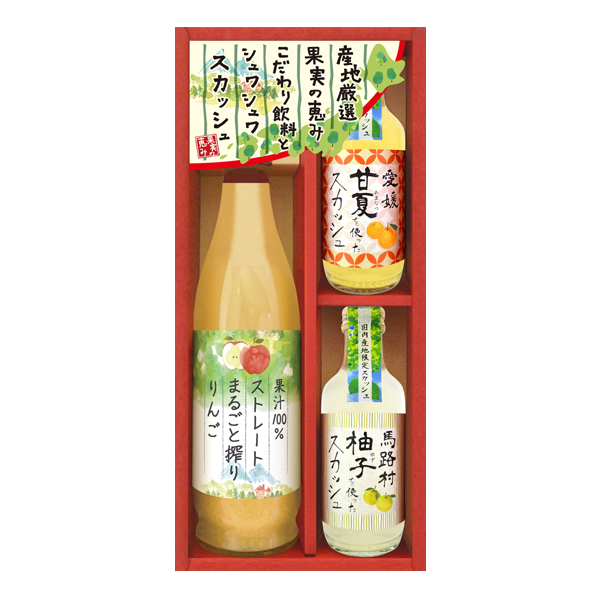 南アルプスの麓で果樹園を営む「なかひら農場」の多彩な果実のドリンクセット。そして、国内産地にこだわったスカッシュは爽やかな炭酸で飲みやすく、各果物の特徴をしっかりと感じられる味わいに仕上がっています。