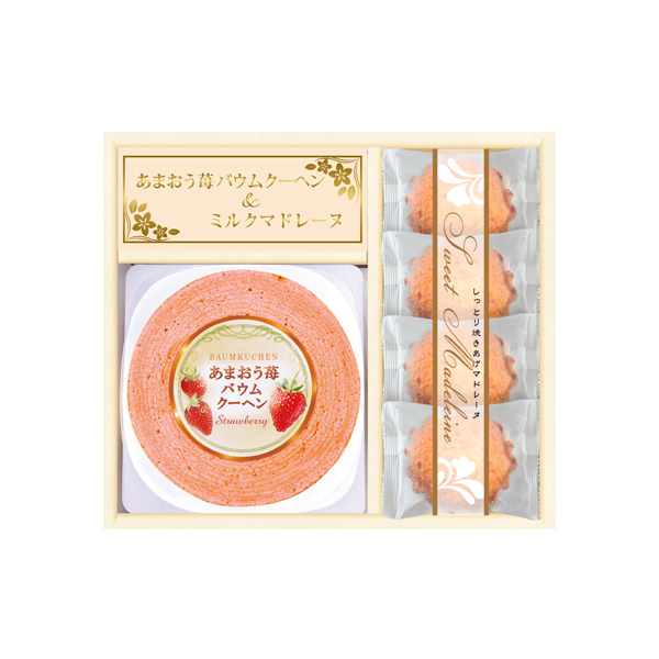 みんな大好きあまおう苺のバウムクーヘンと、サクサク食感のらすくやマドレーヌのスイーツセットです。