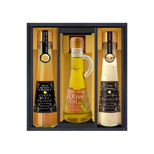 クッキングオイルの代名詞であるエクストラバージンオリーブオイルと、それぞれ個性豊かな特長を持つオリジナルドレッシングがセットになり、パスタやサラダ、幅広いお料理にお使いいただけるおしゃれなギフトです。