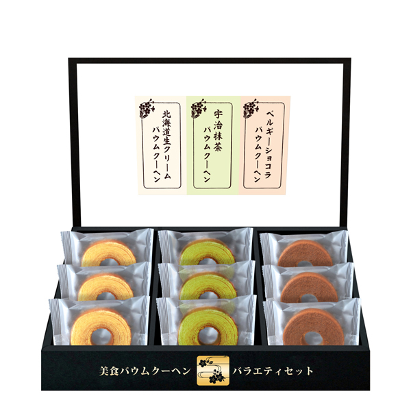 食べやすいサイズで人気のバウムクーヘンセットです。上品な甘味の北海道ミルク、口に入れた瞬間に抹茶の香りが広がる宇治抹茶、ほろ苦いビターな味わいのベルギーショコラは口に入れるとふんわりした口どけが魅力です。