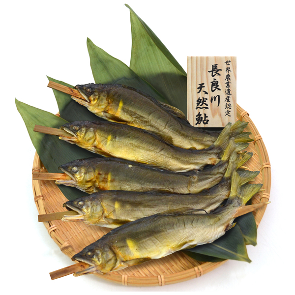 長良川で活き活きと育った天然の鮎。身のしまった鮎はほんのりとした甘みもあり、一番おいしい食べ方とされる塩焼きでお召し上がり下さい。まるで長良川の急流を悠然と泳いでいるかのような踊り串でこんがりと焼きあげました。特別な資格を持つ川漁師が宮内庁にも奉納されている鮎の御漁場の近くで漁をしています。