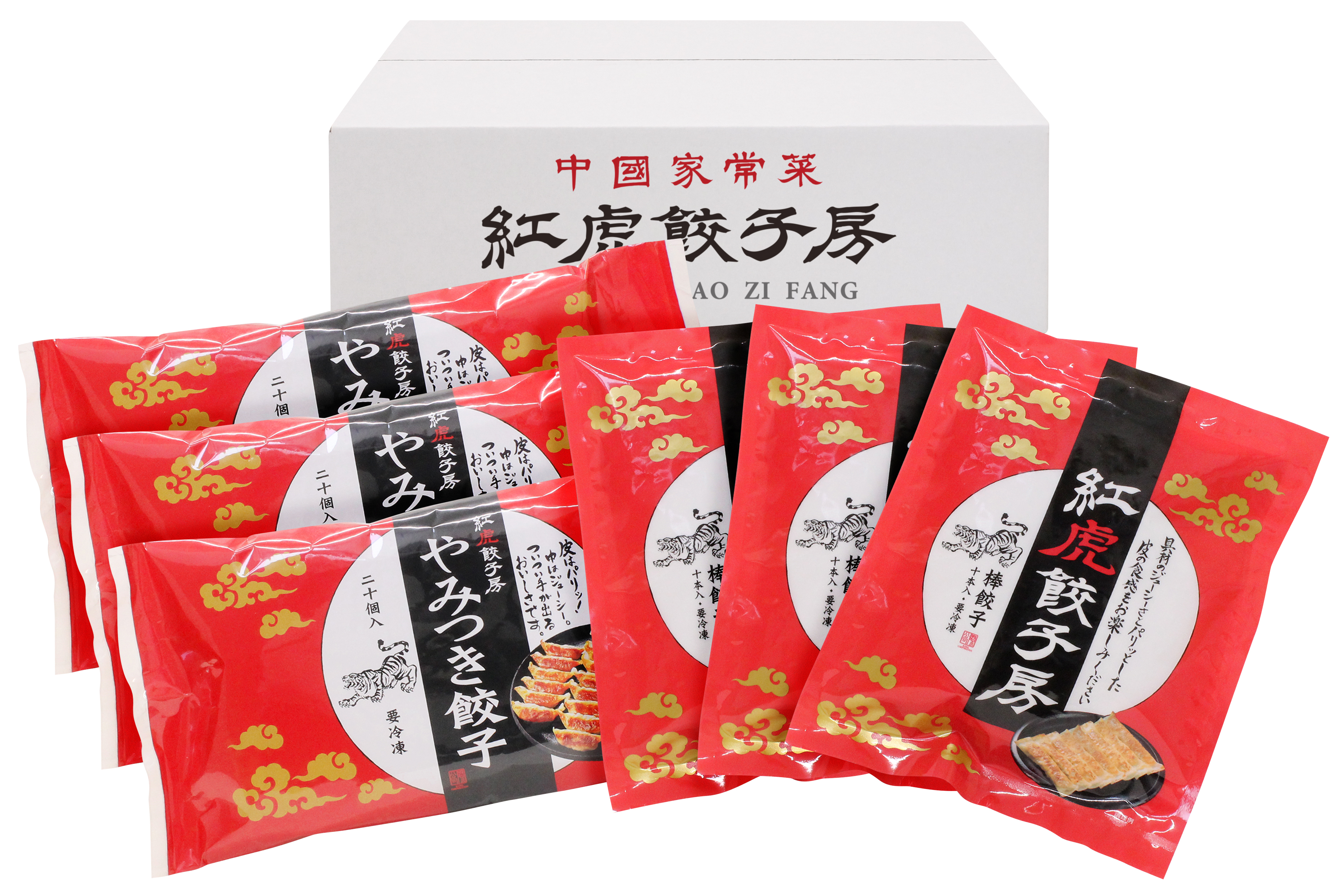皮はパリッとジューシーな棒餃子とついつい手が伸びるやみつき餃子のセット。中華料理レストラン「紅虎餃子房」の味をご家庭でお楽しみいただけます。