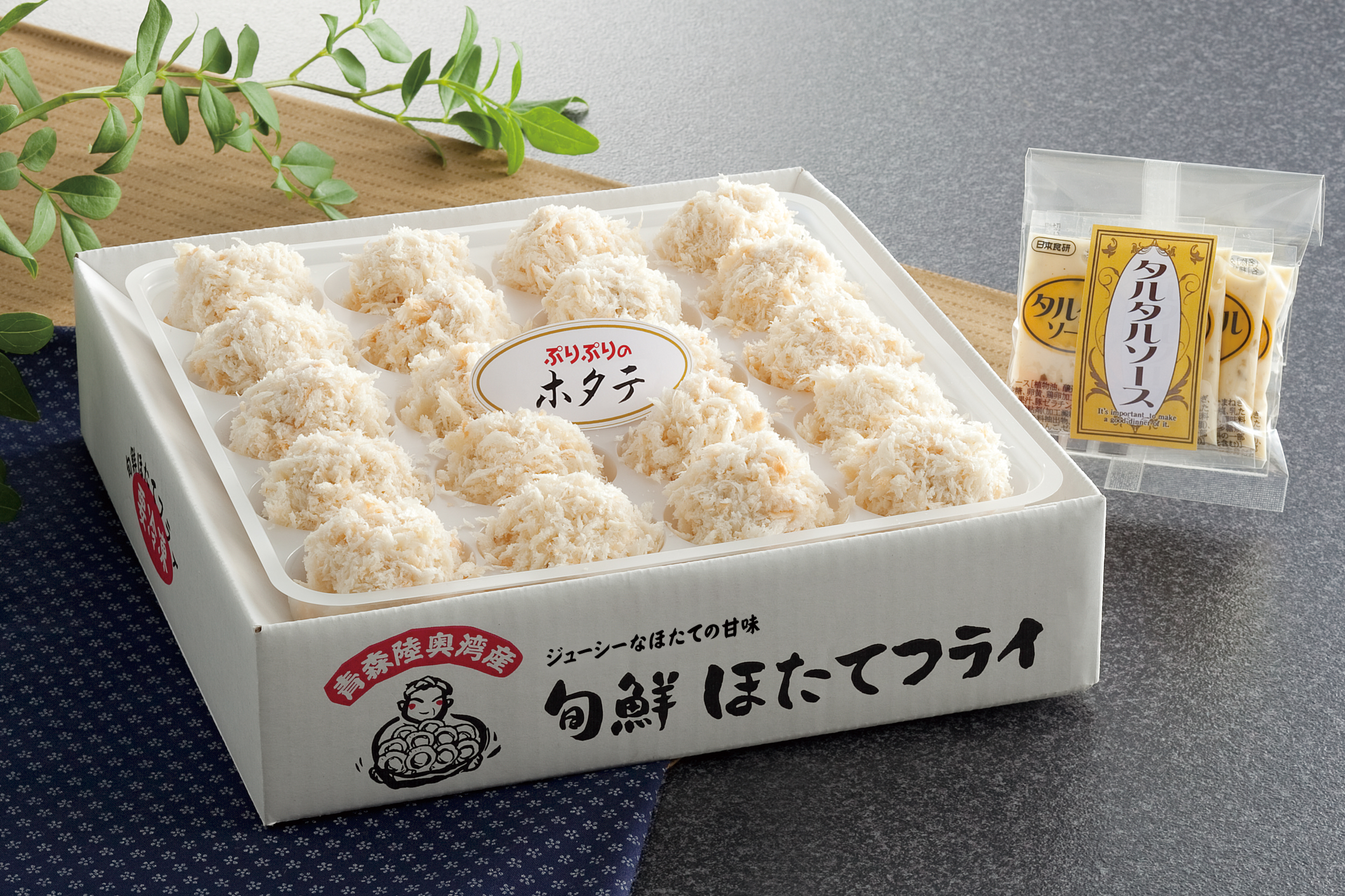 本場、青森陸奥湾で獲れたホタテを使用。ジューシーで甘いホタテの旨味を楽しめます。パン粉を手付けしているので、さっくりとした食感に揚がります。