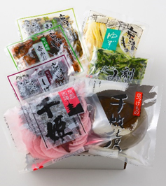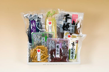 コンクールにて優秀賞を受賞した千姫をはじめ、旬の千枚漬や壬生菜のお漬物等、彩り豊かなお漬物の詰合せです。