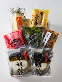季節に応じて漬物に適した野菜を厳選し、一樽一樽丁寧に漬け込んだ京漬物の詰合せです。 東寺漬と千姫は「てが」にしかない、創作漬物です。