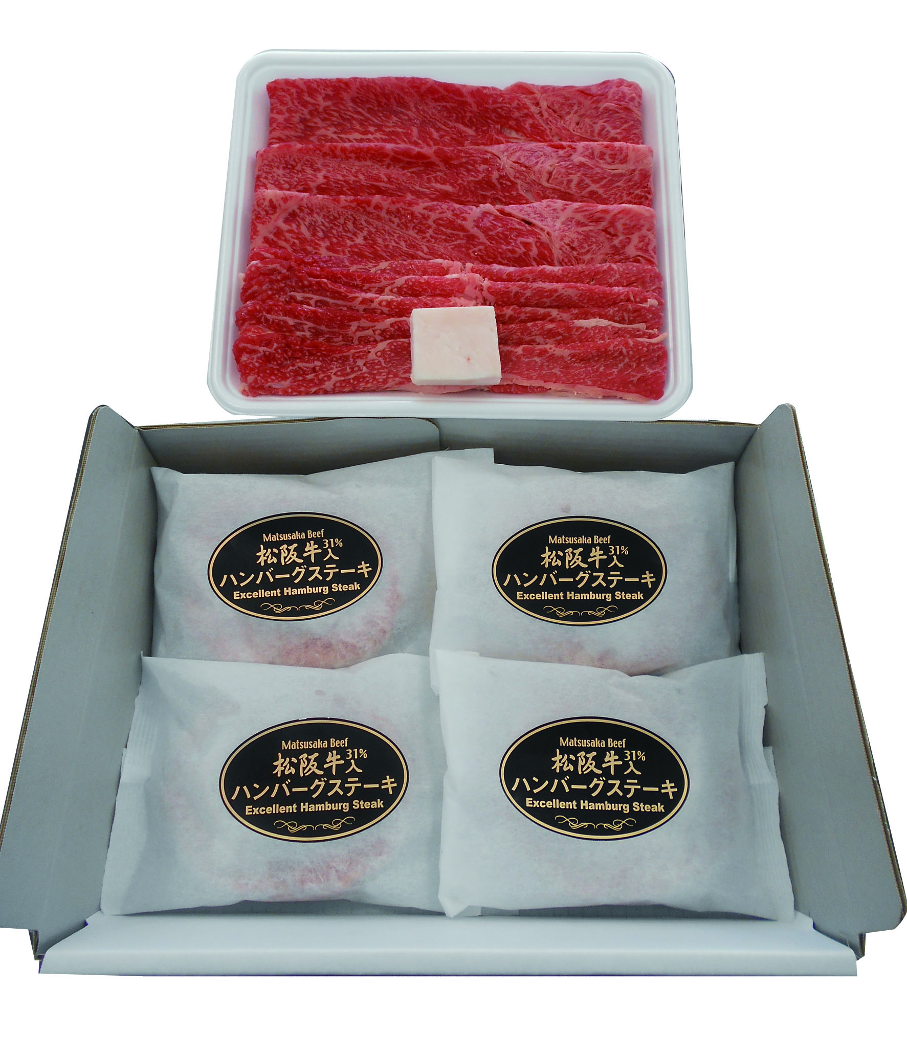 「肉の芸術品」と称賛される松阪牛のすき焼きと松阪牛の美味しさを味わえるハンバーグ、あふれる肉汁と、松阪牛の風味をお楽しみ頂けます。1箱で2度楽しめるセットです。