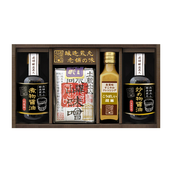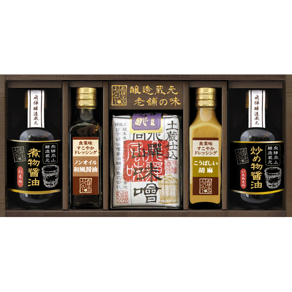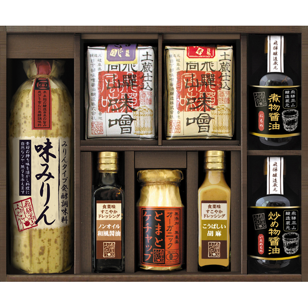 飛騨の老舗で造られたこだわりの味噌や醤油、ドレッシングなどが入った調味料ギフトです。