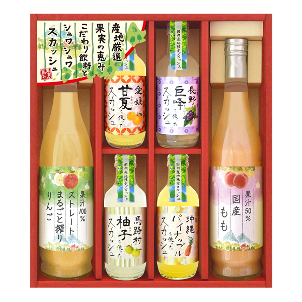 南アルプスの麓で果樹園を営む「なかひら農場」の多彩な果実のドリンクセット。そして、国内産地にこだわったスカッシュは爽やかな炭酸で飲みやすく、各果物の特徴をしっかりと感じられる味わいに仕上がっています。