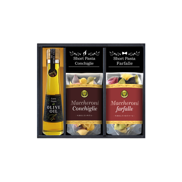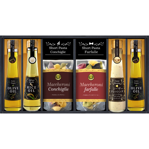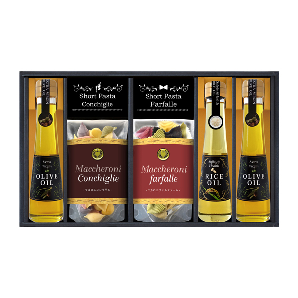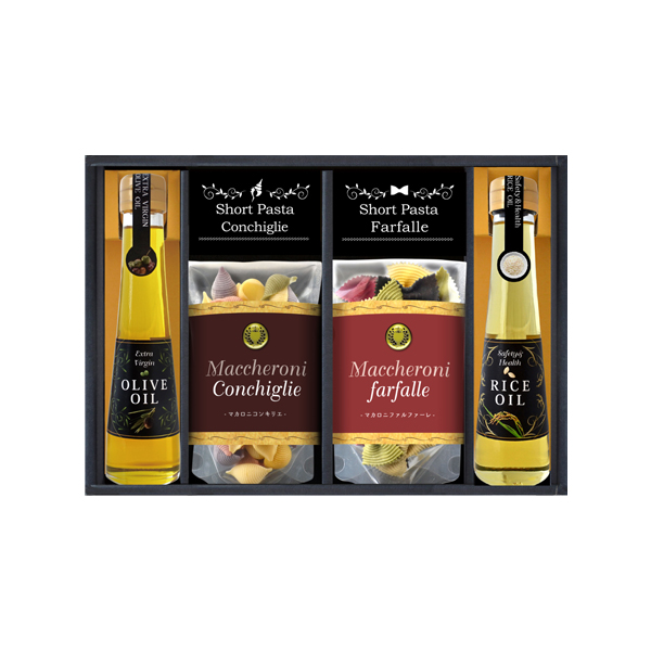 パスタやドレッシングなど幅広いお料理にお使いいただけるエクストラバージンオリーブオイルと、軽くてグリルや炒め物にぴったりな米油、彩りが鮮やかなパスタなどが入ったおしゃれなギフトです。