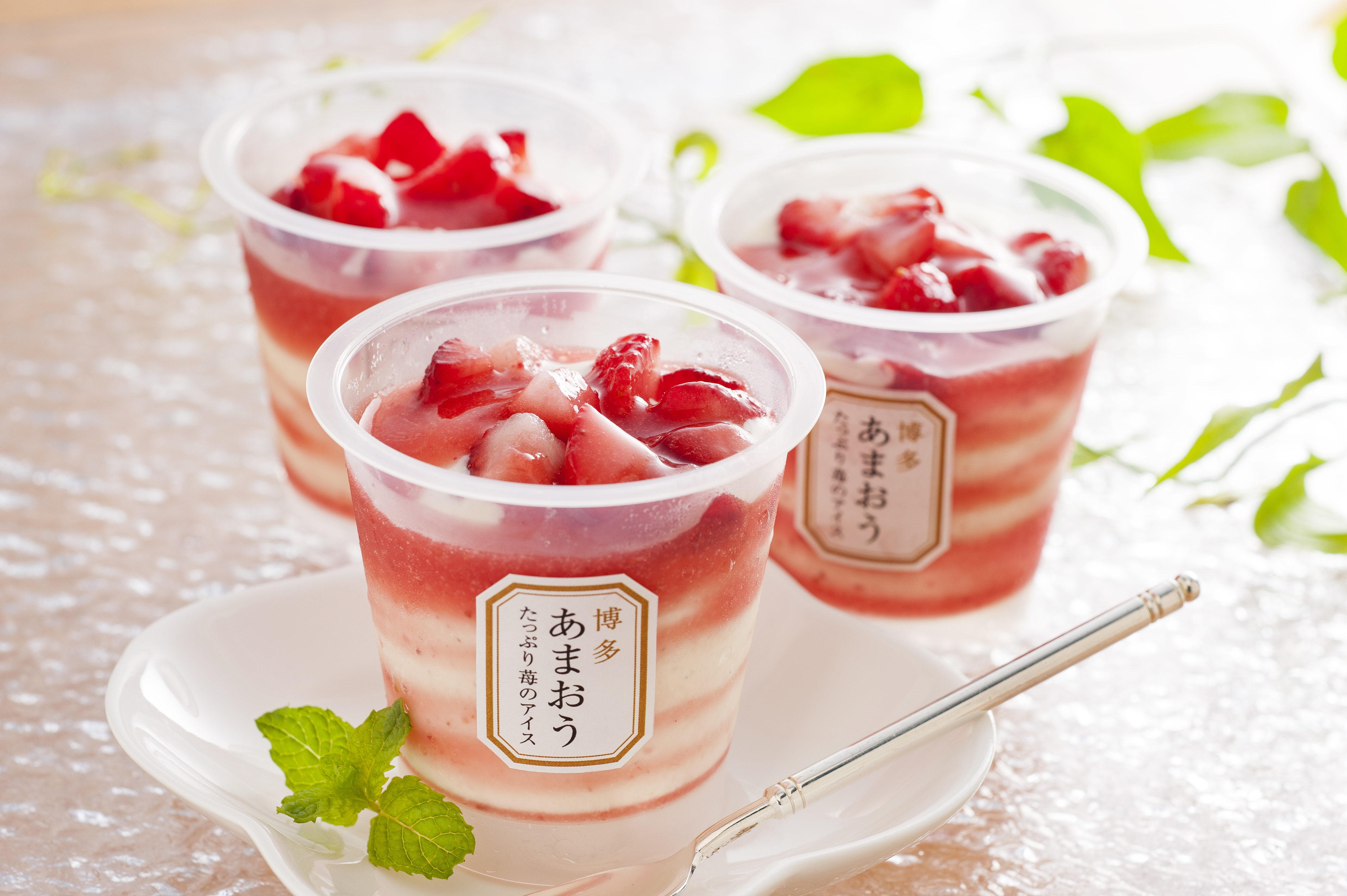 いちごの王様、博多あまおうのソースが入ったアイスの上に、ごろっと果肉をのせた、旬の味と素材感をたっぷり楽しめる、まさにいちご尽くしなアイスです。